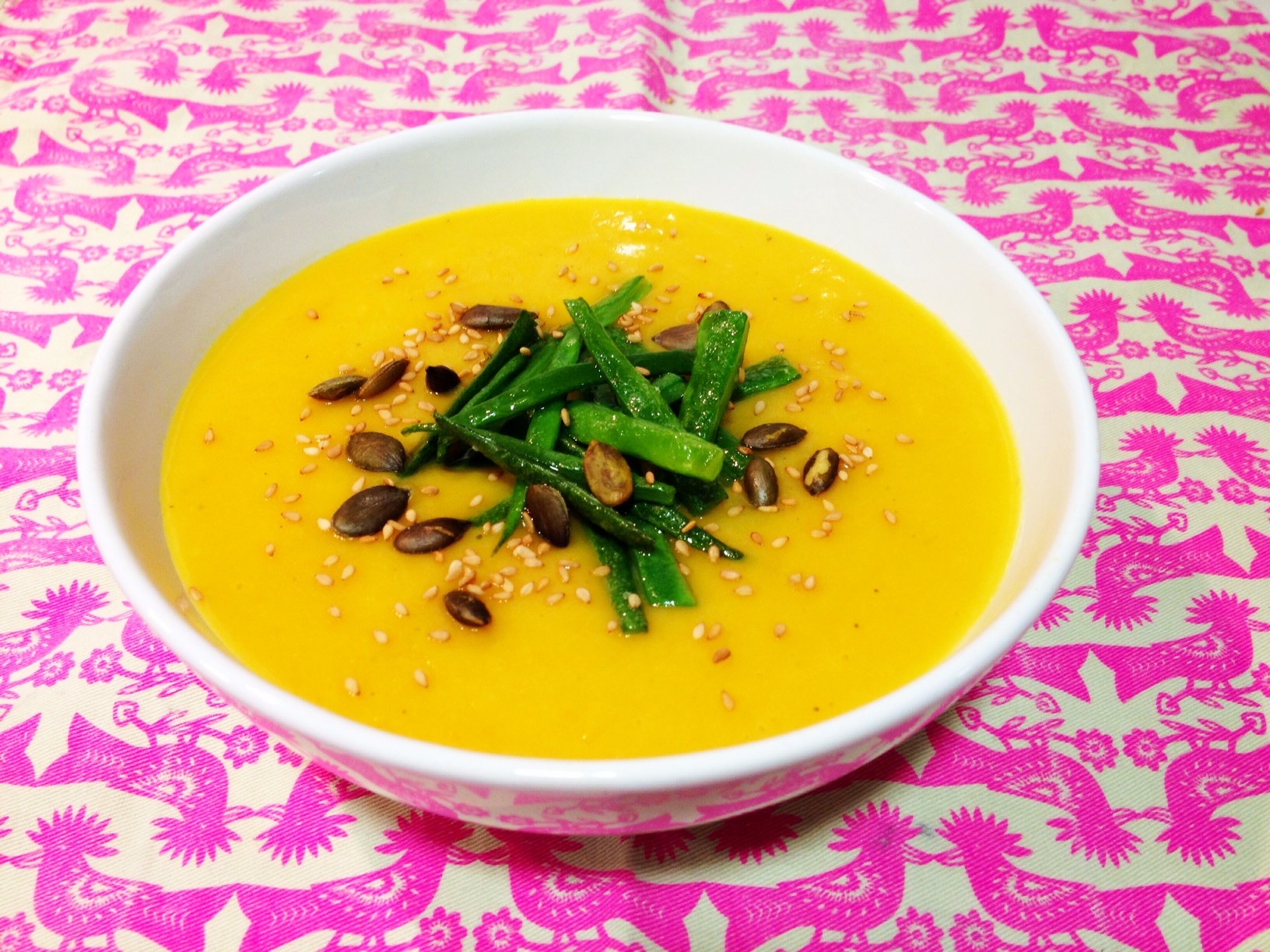 Servimos la crema, poniendo encima las judías, las pipas de calabaza y el sésamo.