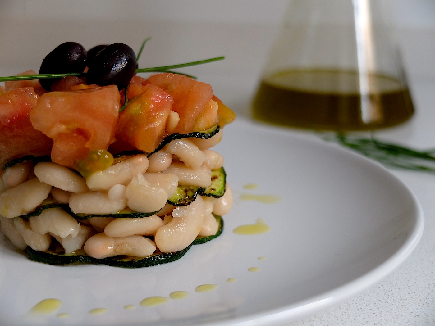 Montamos el timbal en este orden: base de calabacín, judías, calabacín, judías, calabacín, tomate.