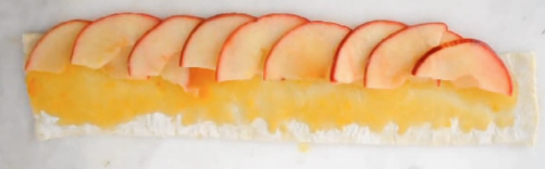 Ahora colocamos una de las tiras y la untamos con la mermelada. Ponemos las manzanas ocupando todo el largo de la mitad horizontal de la tira de hojaldre, debemos poner los cortes de manzana haciendo que la piel roja salga hacia fuera. Así: