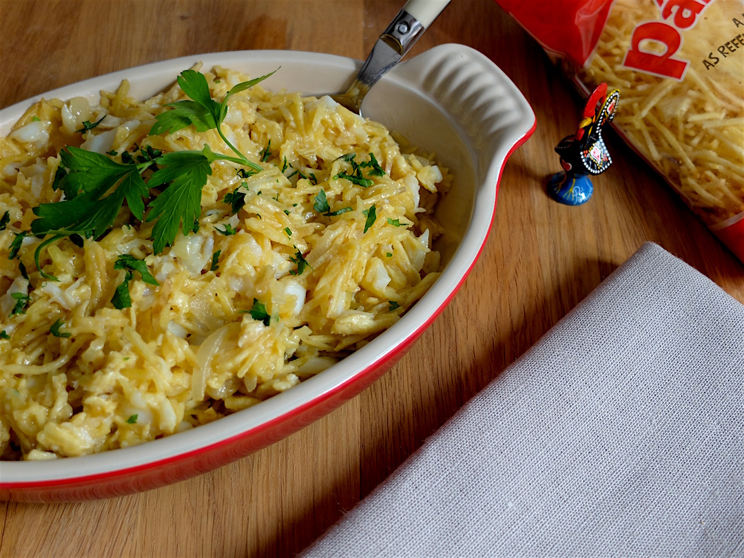 Recién llegada de mis vacaciones de verano en Portugal, una de las primeras recetas portuguesas que he querido preparar es el famoso Bacalhau à Bràs – también conocido en algunas zonas como Bacalao dorado -. Os puedo asegurar que este ha sido el plato estrella de las vacaciones, es delicioso y increíblemente fácil de preparar. Se trata de un plato de bacalao con patatas paja, cebolla y huevo. Confieso que la receta la he hecho con patatas paja que compré en Portugal, especiales para cocina, aunque estoy segura que con las que podemos encontrar en los supermercados también servirán, siempre que sean finitas. ¡Por cierto una curiosidad! Parece que ser que «Bràs» es supuestamente el apellido del señor que inventó este plato. 🙂